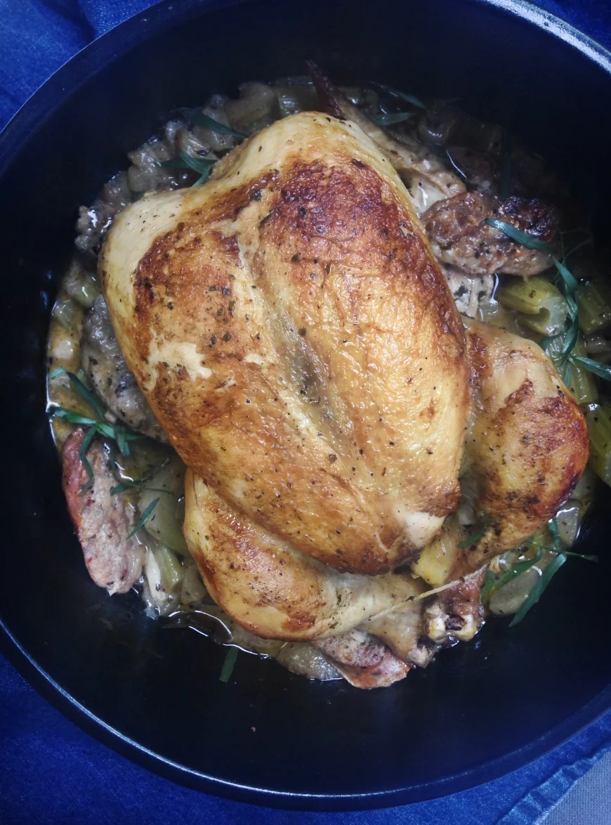 Reduce heat to medium low. Add celery and apples and sauté for 2 to 4 minutes or until they begin to soften. Drain any excess fat. Add cider vinegar, chicken stock, remaining tarragon and bay leaf and bring to boil. Return chicken, sliced sausage and celery to pot, cover and bake in the oven for 1 hour. Remove cover and bake for another 15 minutes or until juices run clear. Cut chicken into four portions and serve with sausage, apples, celery and sauce.